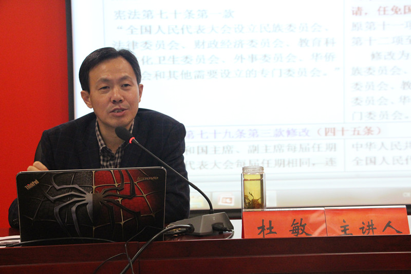 隨后,杜敏教授圍繞《憲法》、《監(jiān)察法》和《中國共產(chǎn)黨紀律處分條例》等黨內法規(guī),深入淺出地闡述了中國憲法制定及修改的歷史脈絡、2018年憲法修改的主要內容以及監(jiān)察法和黨內法規(guī)若干問題等內容,整場報告主題明確,內容豐富,脈絡清晰,既有很強的政策理論性,又有重要的實踐指導性,對提升國有企業(yè)工作人員法治觀念,增強國有企業(yè)改革發(fā)展法治基礎具有重要的指導意義。