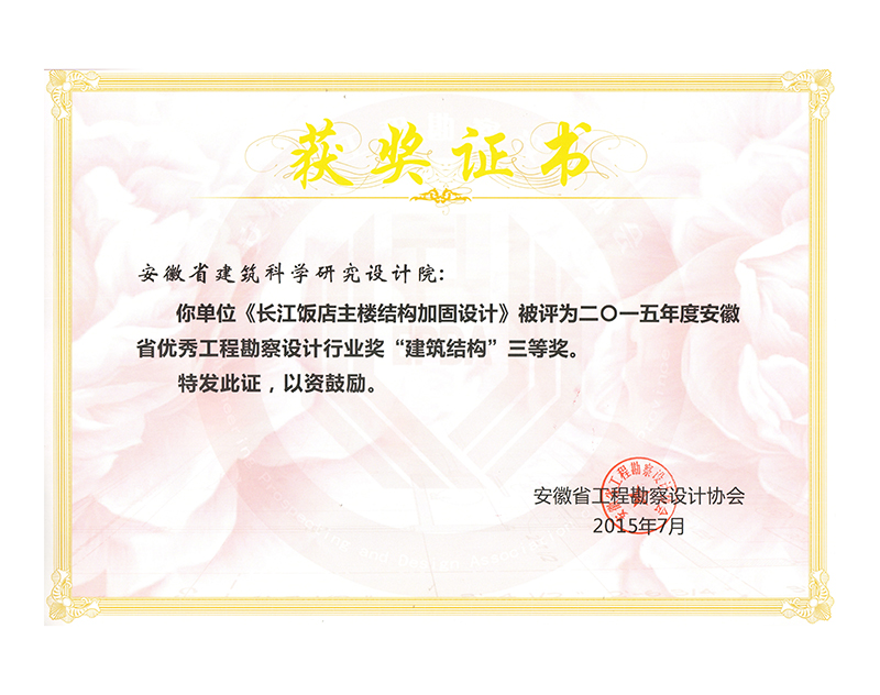 2015年度安徽省優(yōu)秀工程勘察設(shè)計(jì)三等獎(jiǎng)(建筑結(jié)構(gòu))