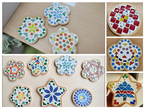馬賽克石的排列不同,最后呈現(xiàn)出的效果也截然不同,團(tuán)員青年們對(duì)照制作說(shuō)明書(shū),通過(guò)一塊塊彩色琉璃小磚的不同拼接、組合,構(gòu)建出漸變、相間、撞色等多種藝術(shù)效果圖案,讓素色杯墊瞬間散發(fā)出獨(dú)一無(wú)二的藝術(shù)魅力。