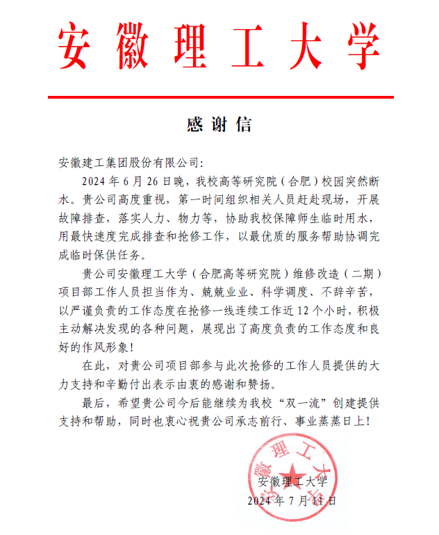 近日,安徽建科總承包分院收到安徽理工大學(xué)感謝信,對(duì)安徽理工大學(xué)(合肥高等研究院)維修改造(二期)項(xiàng)目部在校園夜間突發(fā)斷水搶修過(guò)程中提供的大力支持和辛勤付出表示感謝。